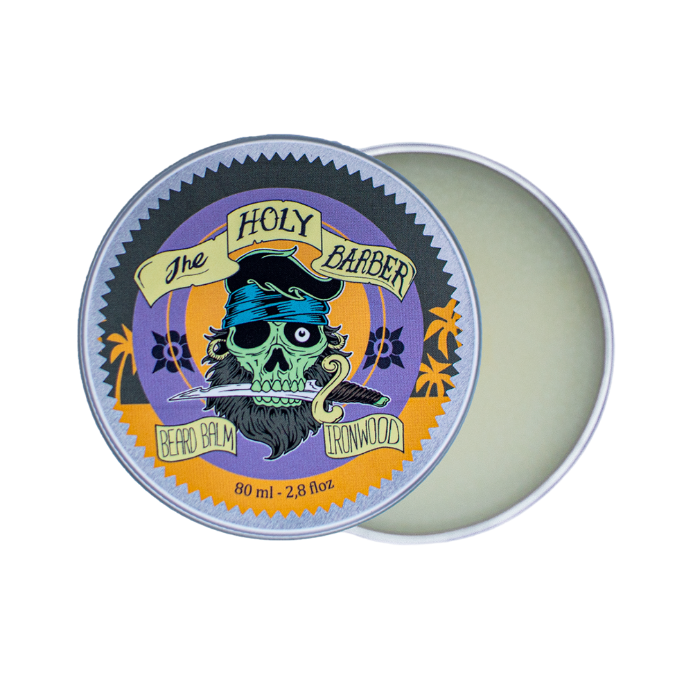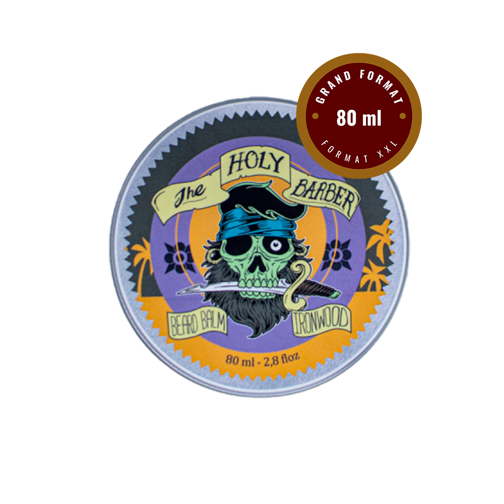 Le baume de barbe Ironwood de The HOLY BARBER contient des ingrédients naturels.